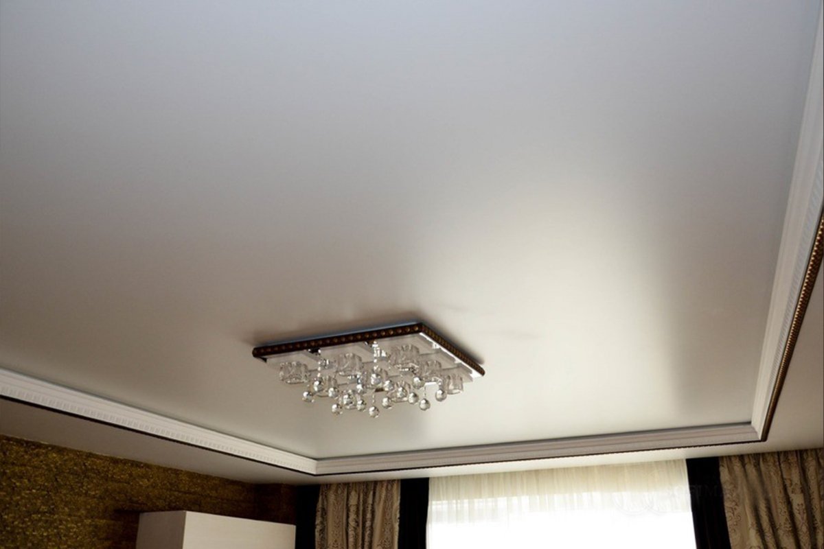 A PVC, canvas or textile sheet is stretched over the frame. This method also allows you to create beautiful and original solutions, and in combination with a suspended ceiling of plasterboard design options are endless. The ceiling can be backlit, the canvas can be made any shape, any color, matte, glossy or with any pattern. If you choose this method of finishing, you will get a perfect even ceiling. Suitable for any room. Minuses – lowers the ceiling, the canvas can tear under strong mechanical pressure, the price.