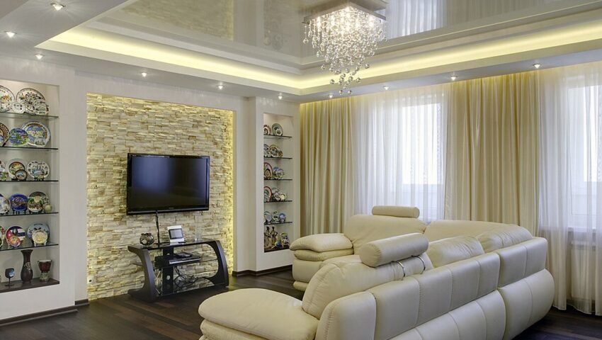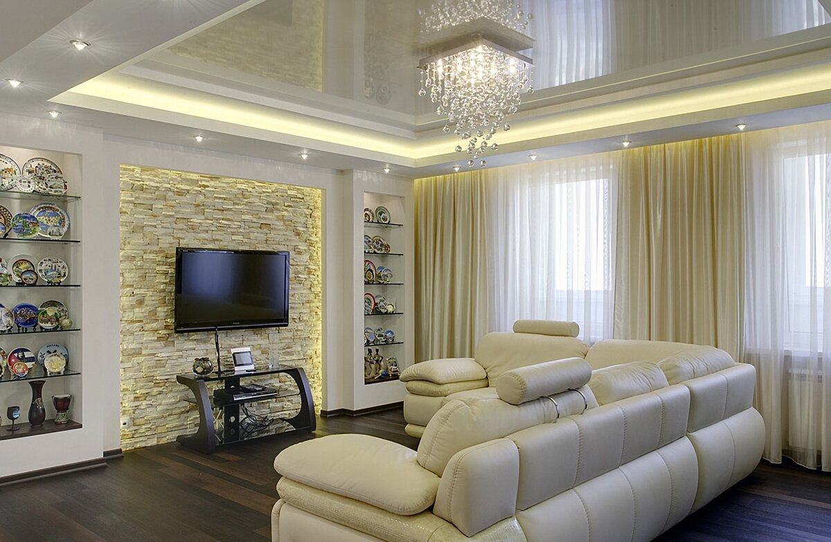 This type of finishing itself allows you to create an amazing design of the ceiling. It can be made simple or tiered, you can add shaped recesses, lighting. Plasterboard is an environmentally friendly and durable material. Panels are attached to the metal structure, inside which you can hide wires, additionally improve the sound and heat insulation of the room. With proper installation, the master achieves a perfectly even ceiling. Can be used in all rooms. Minuses – the price of the structure, the work must be done by a professional.